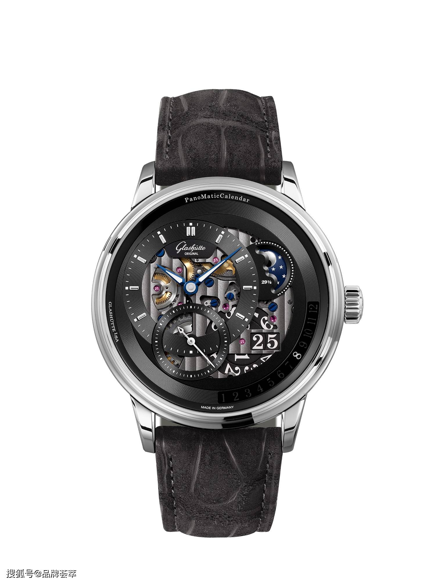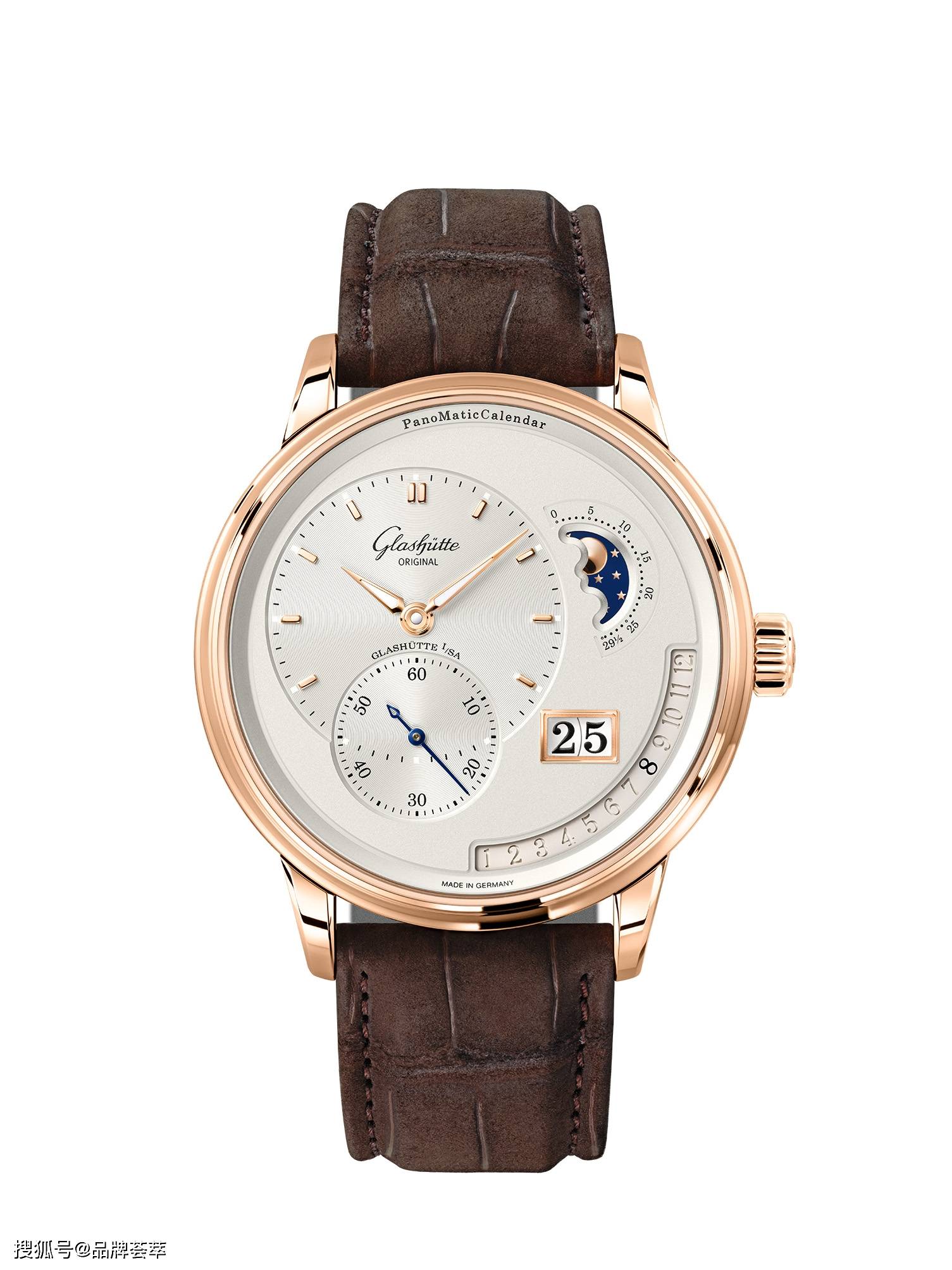 两个表款的时分和小秒盘均采用品牌标志性的不对称显示,月相盘位于2点钟位置,透过3点钟和6点钟位置之间的弧形蓝宝石水晶玻璃窗,颇具创意的月份显示与其相映成趣。此外,格拉苏蒂原创独有的大日历显示位于4点钟位置,其金色边框首度在红金表款中亮相。